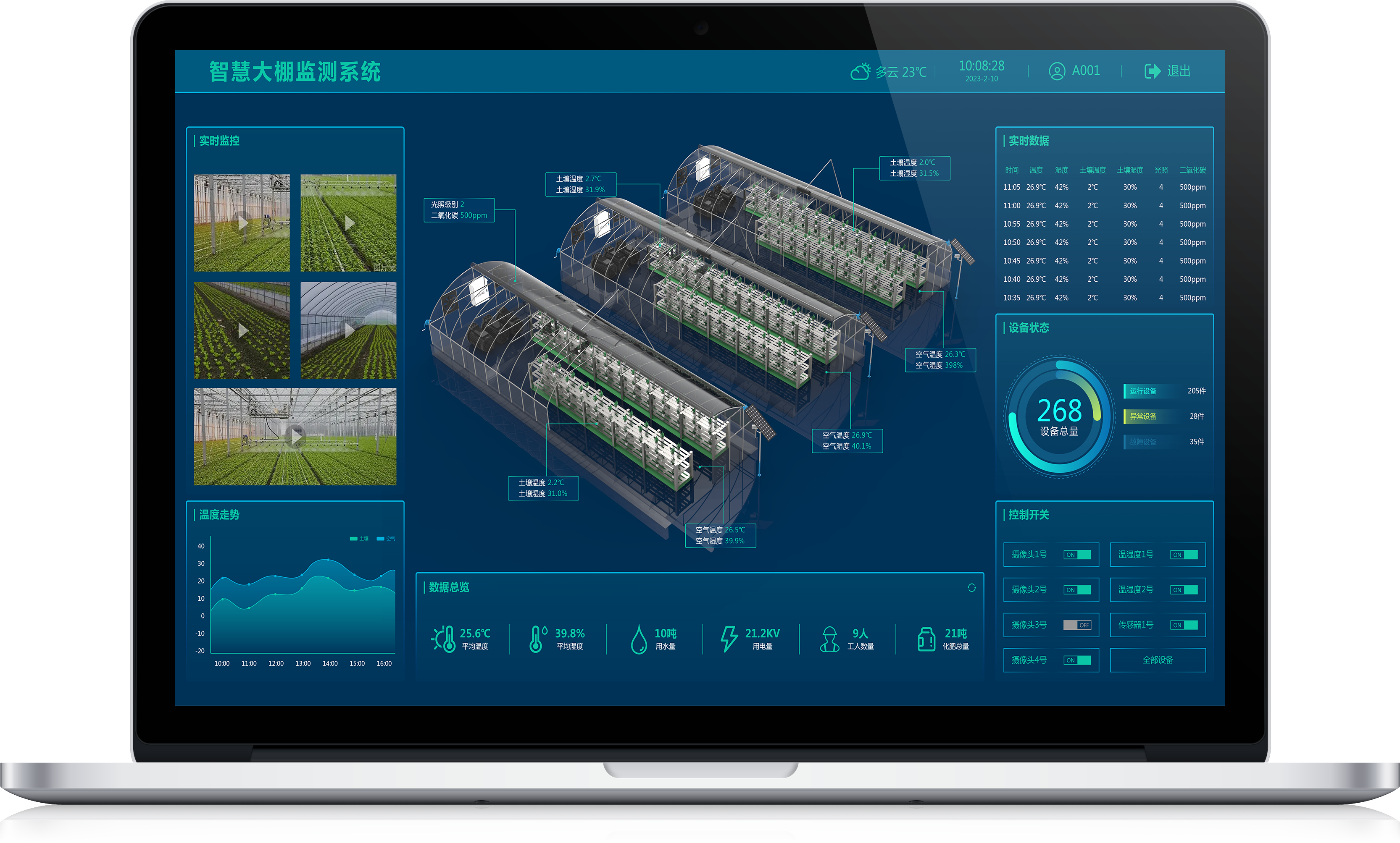2、实时监测:实时监控温室内的空气温度、空气湿度等数据;